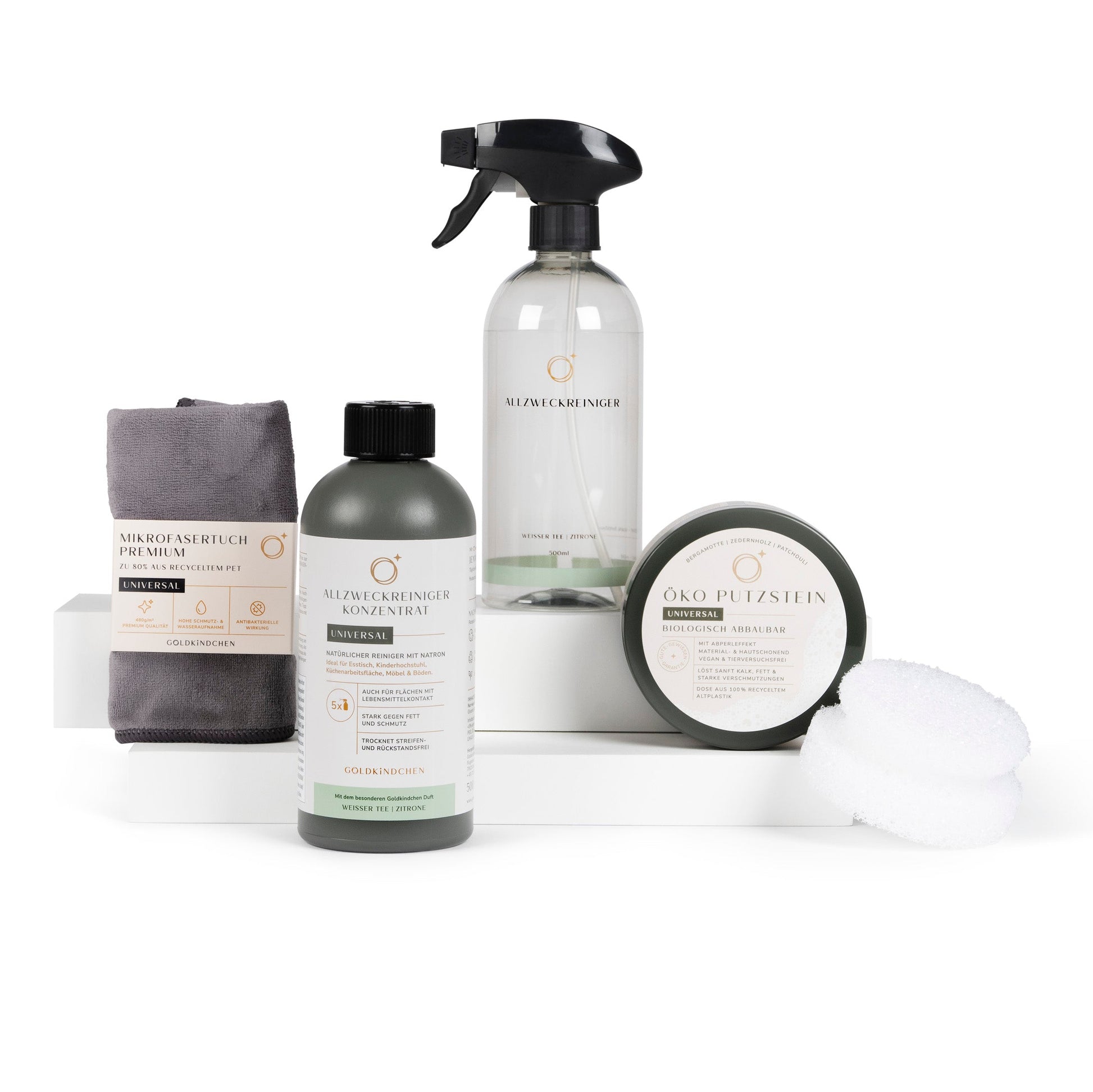 Das Set ist nachhaltig konzipiert – mit Flaschen aus recyceltem Kunststoff und in Deutschland hergestellt.