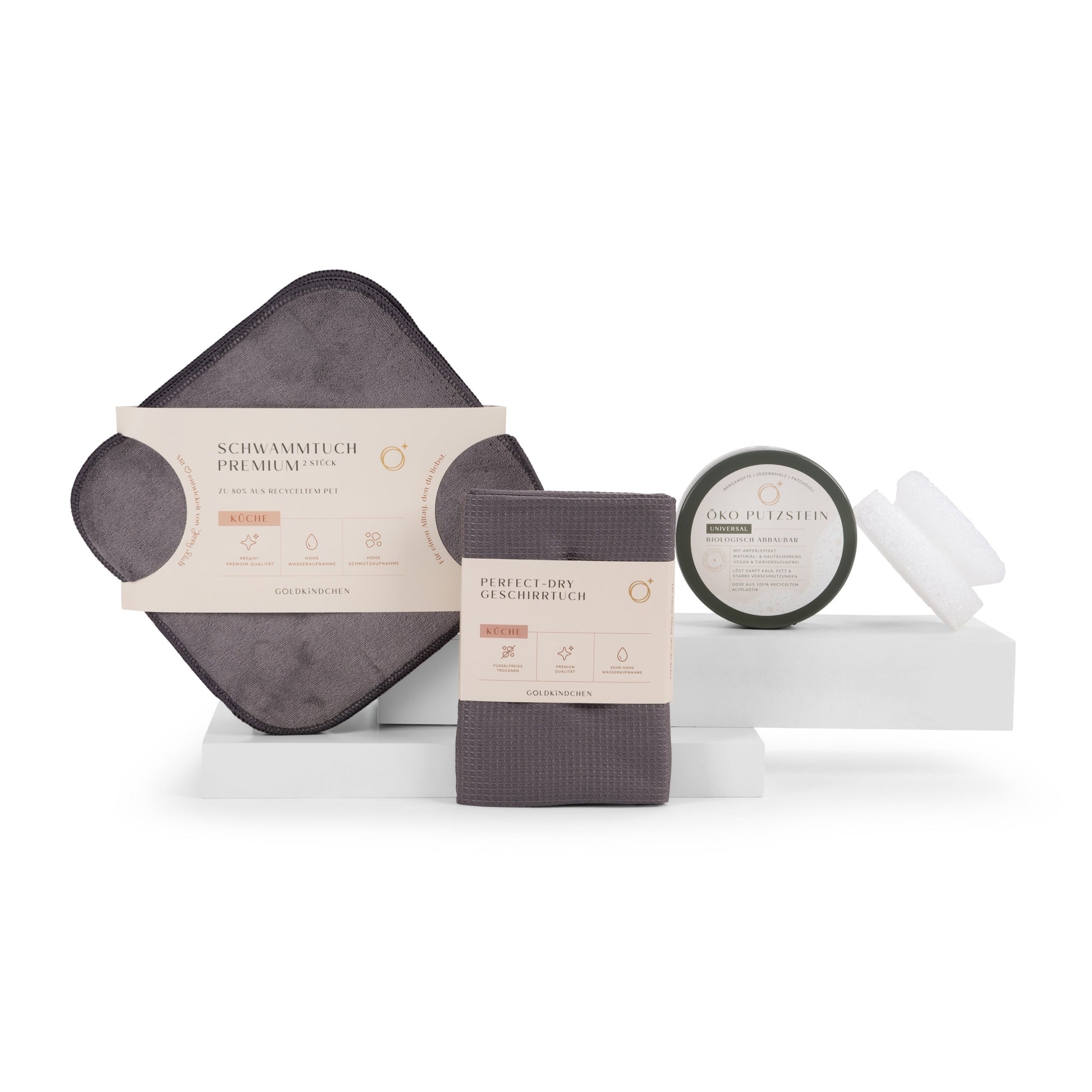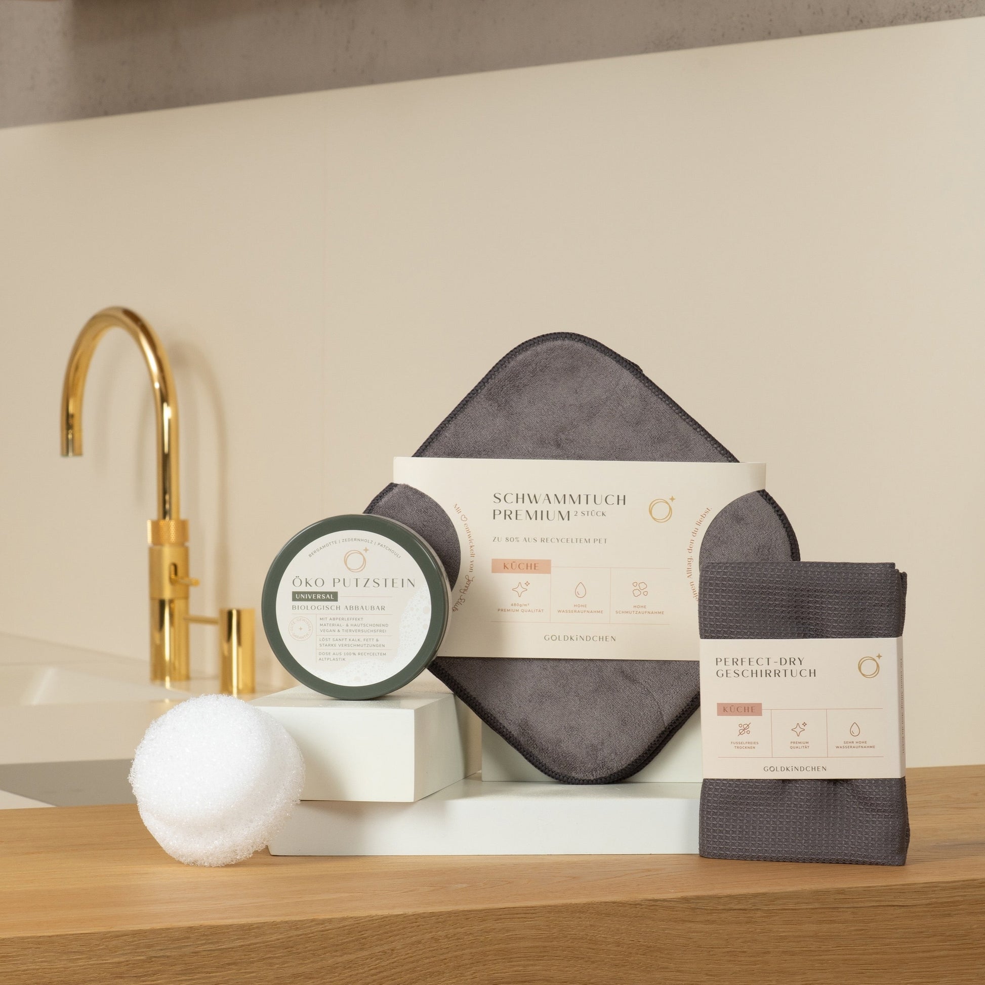 Die Premium Schwammtücher bestehen zu 80% aus recyceltem PET und zu 20% aus Polyamid.